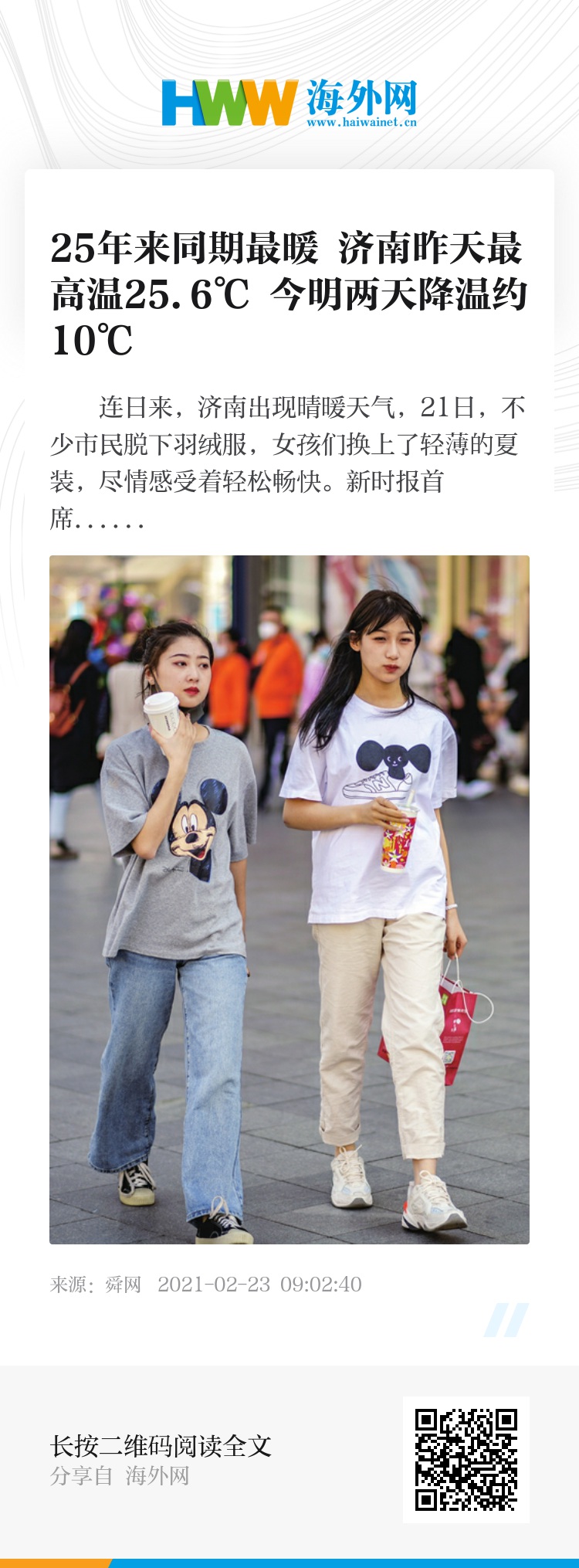 连日来,济南出现晴暖天气,21日,不少市民脱下羽绒服,女孩们换上了轻薄的夏装,尽情感受着轻松畅快。