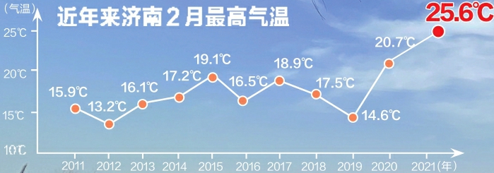 “气象史”中的2月是什么天气呢?新时报记者从济南市气象台获悉,据龟山气象观测站记录,截至目前,济南2月份最高气温出现在1996年,最高气温为25.7℃。而今年2月21日25.6℃的最高气温值以0.1℃之差仅次于这个同期最暖纪录,成为1951年有气象监测记录以来2月里“第二暖”的一天。