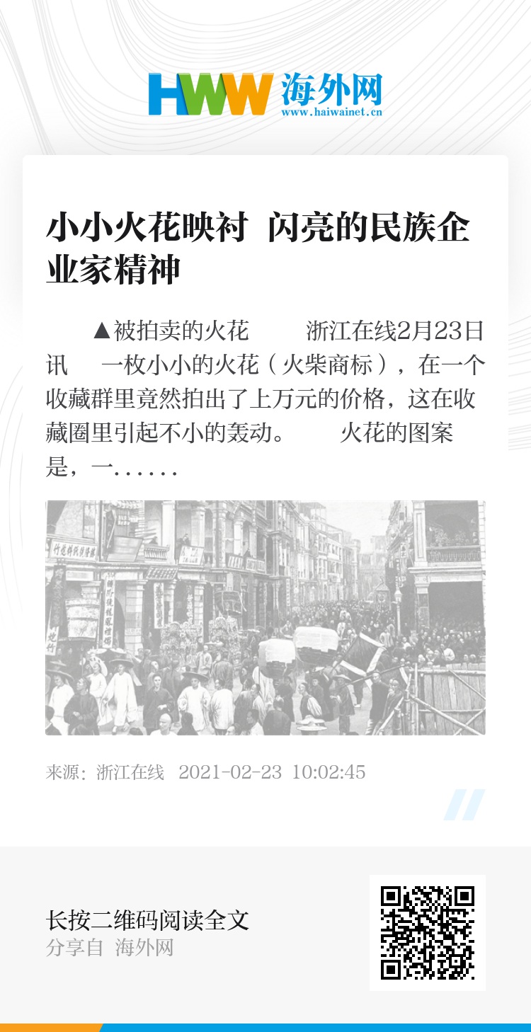 浙江在线2月23日讯 一枚小小的火花(火柴商标),在一个收藏群里竟然拍出了上万元的价格,这在收藏圈里引起不小的轰动。