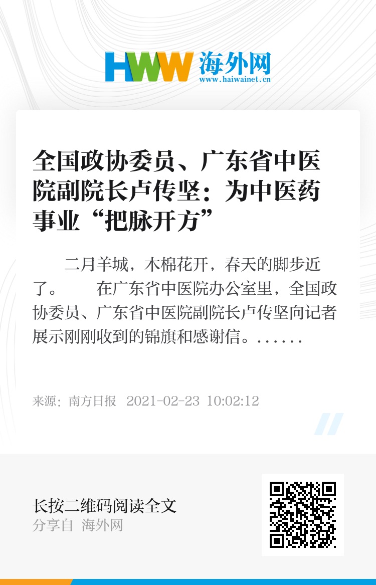 2020年两会期间,卢传坚提出“建立机制,将中医药常规纳入国家传染病防治体系”的建议。呼吁落地,期盼成真。2020年,国家发改委、财政部安排51.98亿元支持各级中医院传染病防控救治能力建设,目前国家已布局建设国家中医药传染病临床研究中心、中西医结合传染病临床研究基地。
