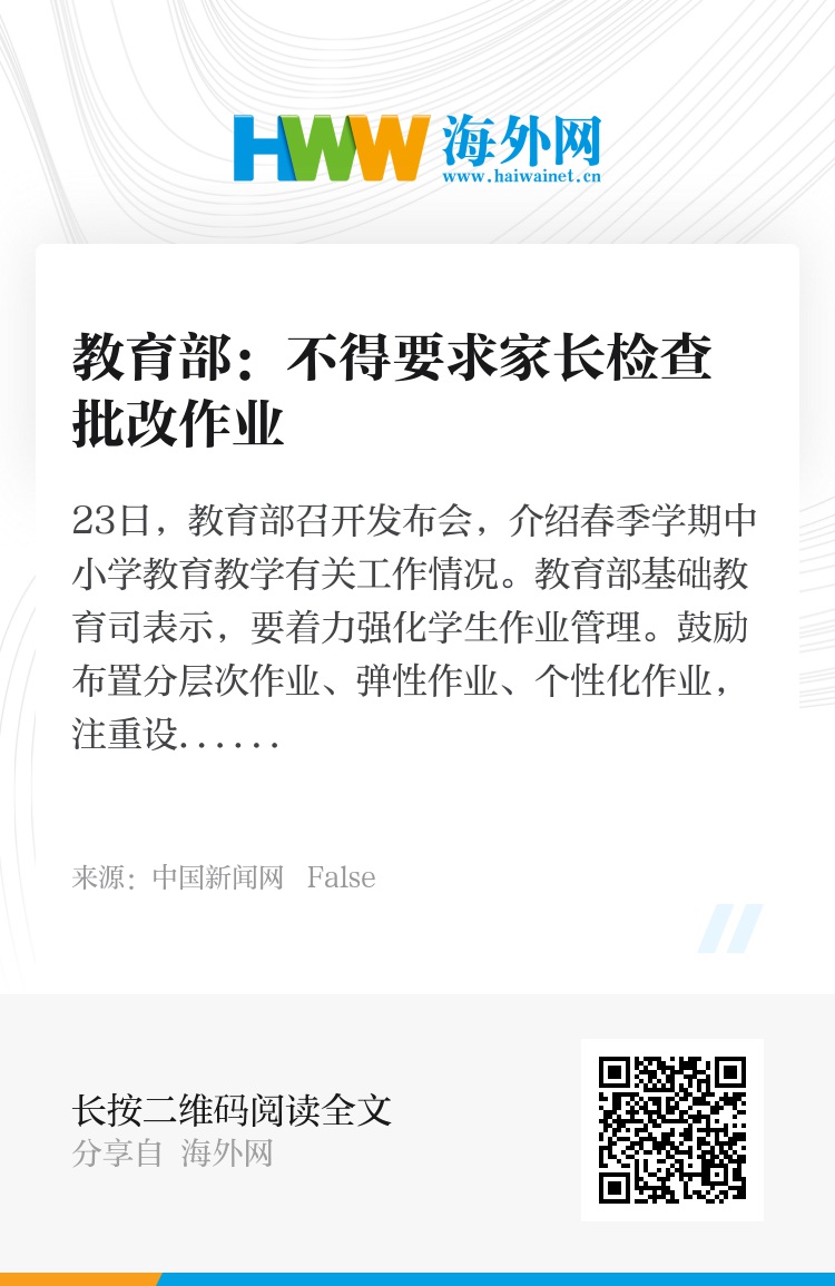 23日,教育部召开发布会,介绍春季学期中小学教育教学有关工作情况。教育部基础教育司表示,要着力强化学生作业管理。鼓励布置分层次作业、弹性作业、个性化作业,注重设计探究性作业、实践性作业,探索跨学科作业、综合性作业,坚决克服机械、无效作业,杜绝重复性、惩罚性作业。任课教师要认真批改作业,及时做好反馈,注重加强面批讲解,认真分析学情,对存在的问题做好学生答疑辅导。不得给家长布置或变相布置作业,不得要求家长检查、批改作业。(郎朗)