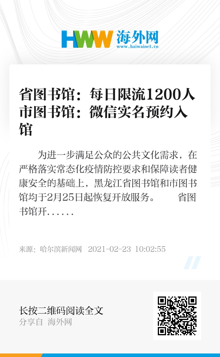为进一步满足公众的公共文化需求,在严格落实常态化疫情防控要求和保障读者健康安全的基础上,黑龙江省图书馆和市图书馆均于2月25日起恢复开放服务。