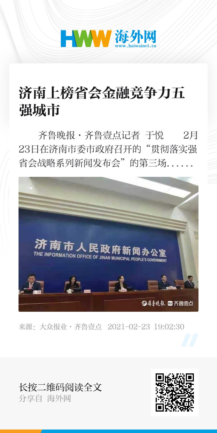 2月23日在济南市委市政府召开的“贯彻落实强省会战略系列新闻发布会”的第三场发布会上,济南市地方金融监管局党组成员、副局长李洪伟介绍,2020年,济南市金融业在常态化疫情防控中运行态势良好,发展活力迸发,为全市经济社会发展做出了突出贡献,在新财富《省会城市金融竞争力榜》中上榜省会金融竞争力五强城市。