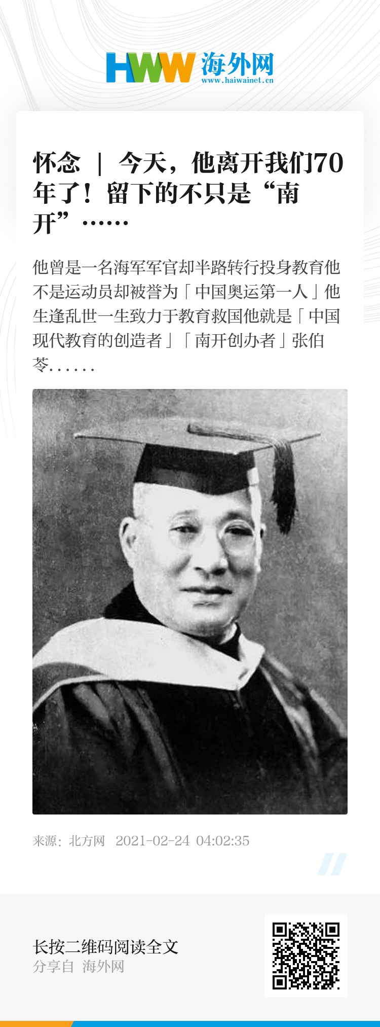 是张伯苓先生逝世70周年纪念日