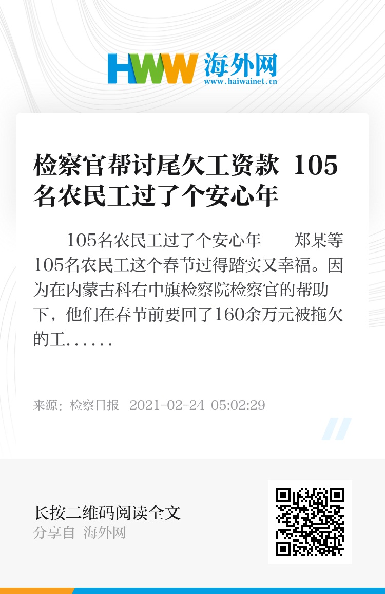 郑某等105名农民工这个春节过得踏实又幸福。因为在内蒙古科右中旗检察院检察官的帮助下,他们在春节前要回了160余万元被拖欠的工资,尾欠工资款也将在今年4月底全部到账。