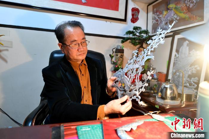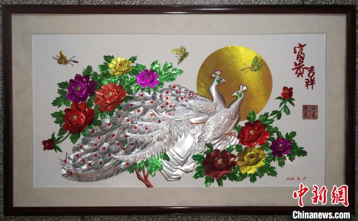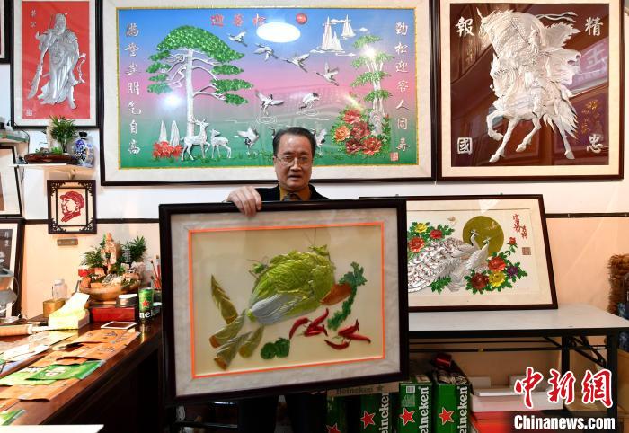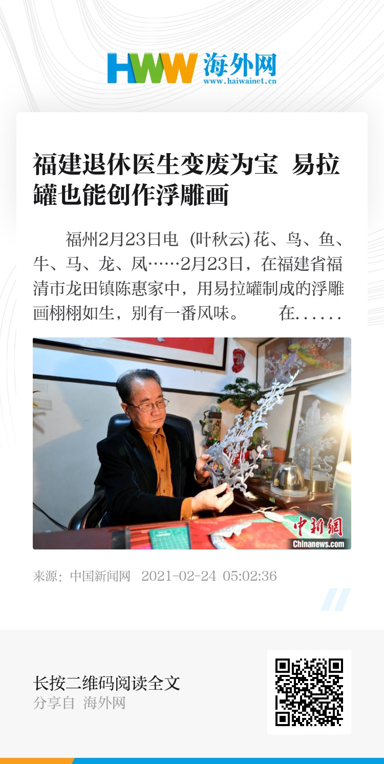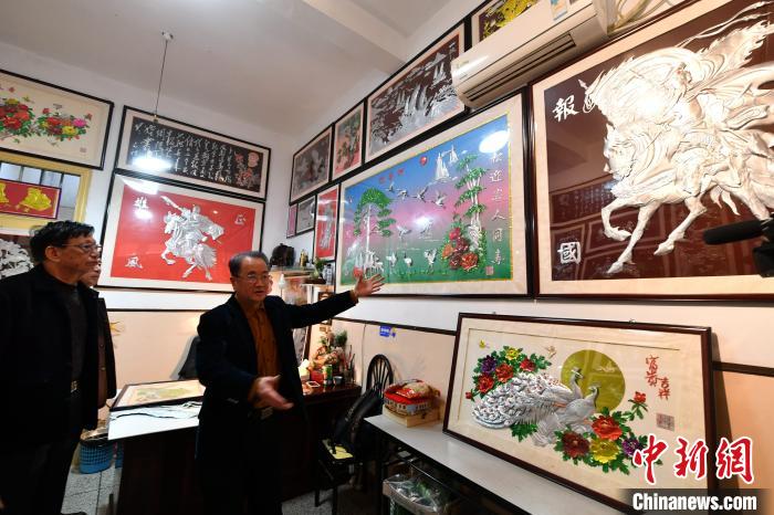 中新网福州2月23日电 (叶秋云)花、鸟、鱼、牛、马、龙、凤……2月23日,在福建省福清市龙田镇陈惠家中,用易拉罐制成的浮雕画栩栩如生,别有一番风味。