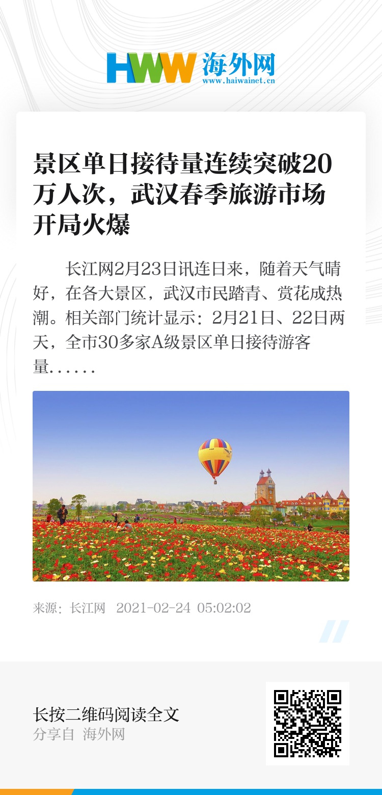 随着春暖花开,市民出游意愿增强,武汉市各景区一方面依然做好分时限流、提前预约等措施,严格要求入园游客积极出示健康码和戴口罩,更好地保障游客安全;一方面不断丰富春季旅游产品,积极盘活本地旅游市场。