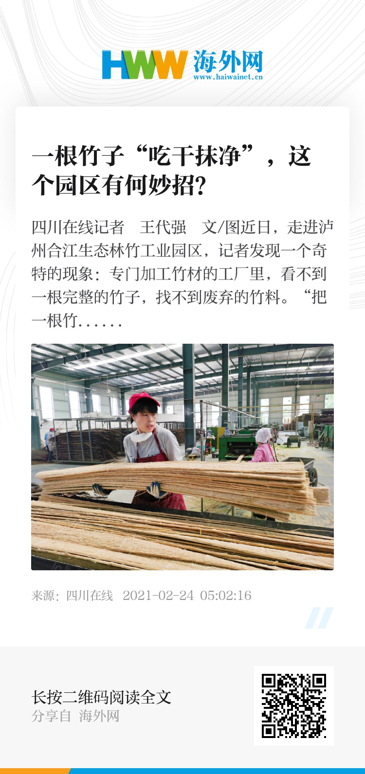 近日,走进泸州合江生态林竹工业园区,记者发现一个奇特的现象:专门加工竹材的工厂里,看不到一根完整的竹子,找不到废弃的竹料。