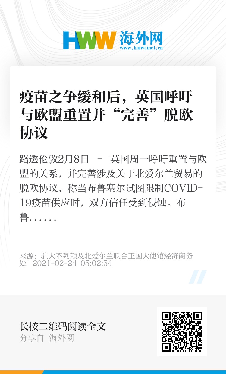 虽然欧盟迅速改变了其在疫苗上的立场,但伦敦希望利用疫苗之争契机推动脱欧协议的调整,因为新规定已经导致英国与北爱尔兰的贸易受到干扰。