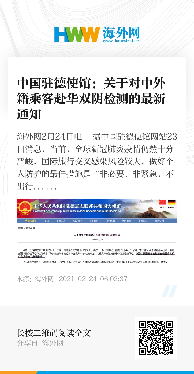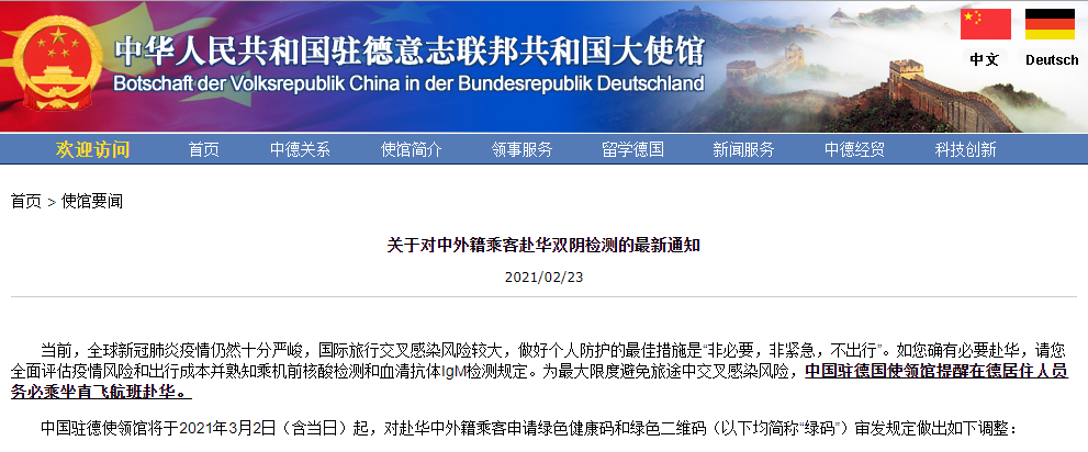 中国驻德使领馆将于2021年3月2日(含当日)起,对赴华中外籍乘客申请绿色健康码和绿色二维码(以下均简称“绿码”)审发规定做出如下调整:
