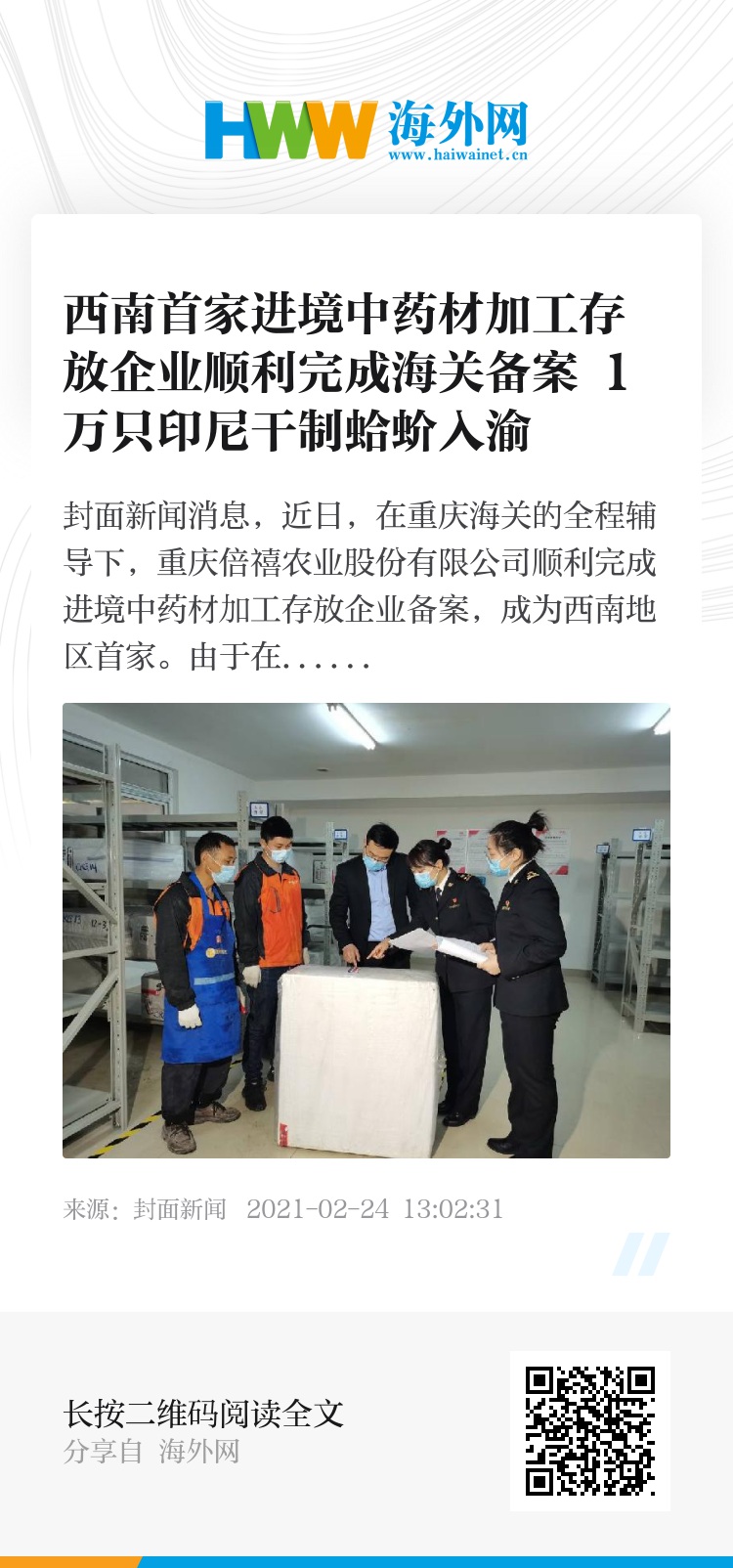 封面新闻消息,近日,在重庆海关的全程辅导下,重庆倍禧农业股份有限公司顺利完成进境中药材加工存放企业备案,成为西南地区首家。由于在海关完成备案,企业仓库也迎来了首批1万只印度尼西亚干制蛤蚧。