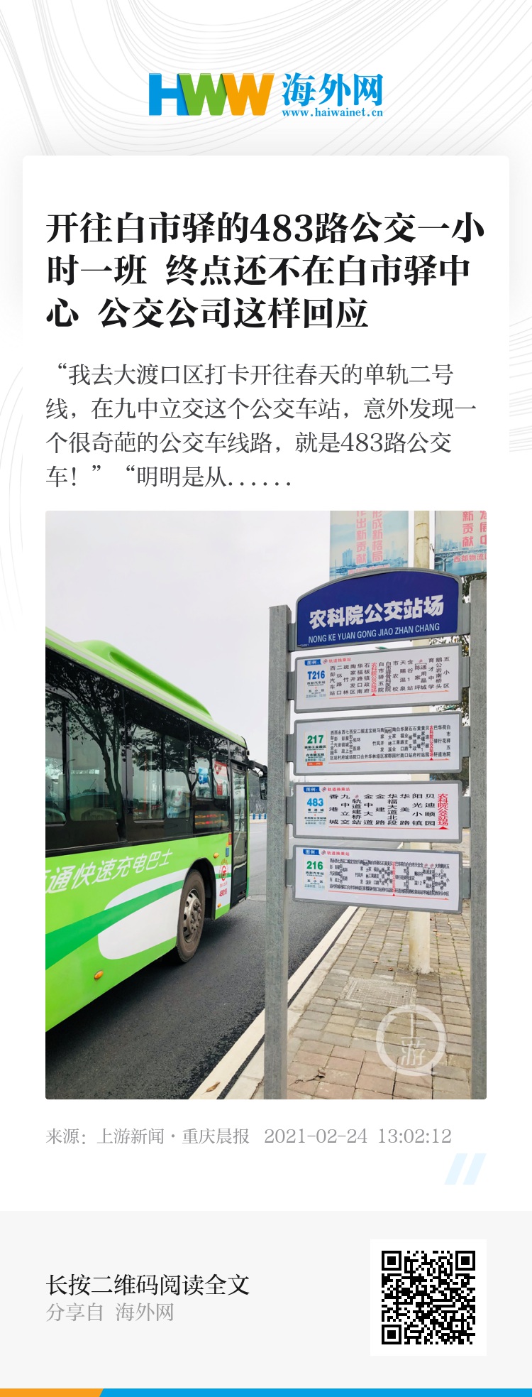 2月22日,一位网民发文吐槽483路公交车站点设置不合理。该网民表示,483路公交车的开通,应该是华岩隧道修通之后,为了方便白市驿人民去大渡口区乘坐单轨二号线,但终点站却是在农科院。23日,上游新闻·重庆晨报记者对此进行了走访调查。