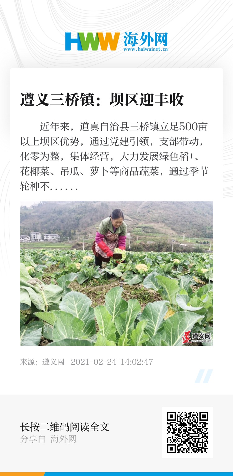 近年来,道真自治县三桥镇立足500亩以上坝区优势,通过党建引领,支部带动,化零为整,集体经营,大力发展绿色稻+、花椰菜、吊瓜、萝卜等商品蔬菜,通过季节轮种不断提高土地利用率,实现了亩产2万元以上。