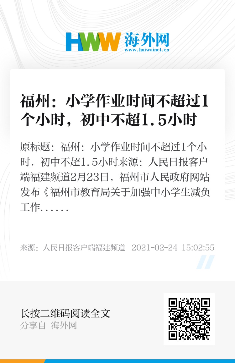 2月23日,福州市人民政府网站发布《福州市教育局关于加强中小学生减负工作的通知》