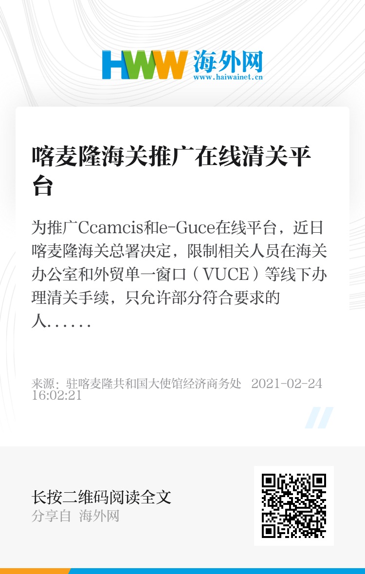 为推广Ccamcis和e-Guce在线平台,近日喀麦隆海关总署决定,限制相关人员在海关办公室和外贸单一窗口(VUCE)等线下办理清关手续,只允许部分符合要求的人员在预约后赴现场办理。海关总署表示,通过Ccamcis和e-Guce在线平台,用户可远程进行清关、缴税等操作。此举有助于提高贸易便利化,保障税收收入,获取及时可靠贸易数据。