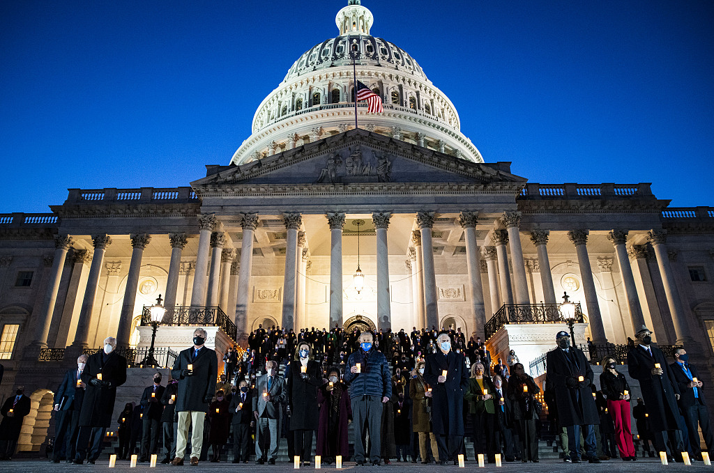 当地时间2021年2月23日,美国国会议员为在新冠疫情中丧生的50万美国人举行烛光守夜活动,议员们举着烛台默哀,悼念因新冠丧生的50万美国人。《国会山报》说,活动举行之际,美国新冠死亡病例已超50万例,新冠确诊病例已超2800万例。图片来源:视觉中国