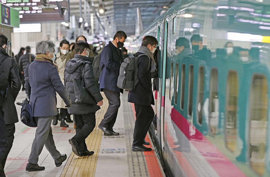 当地时间2月24日,日本仙台的乘客在仙台站乘坐新干线列车。东京至日本东北部的新干线列车在因东北地区遭受强烈地震中断11天后,于24日恢复了服务。图片来源:视觉中国