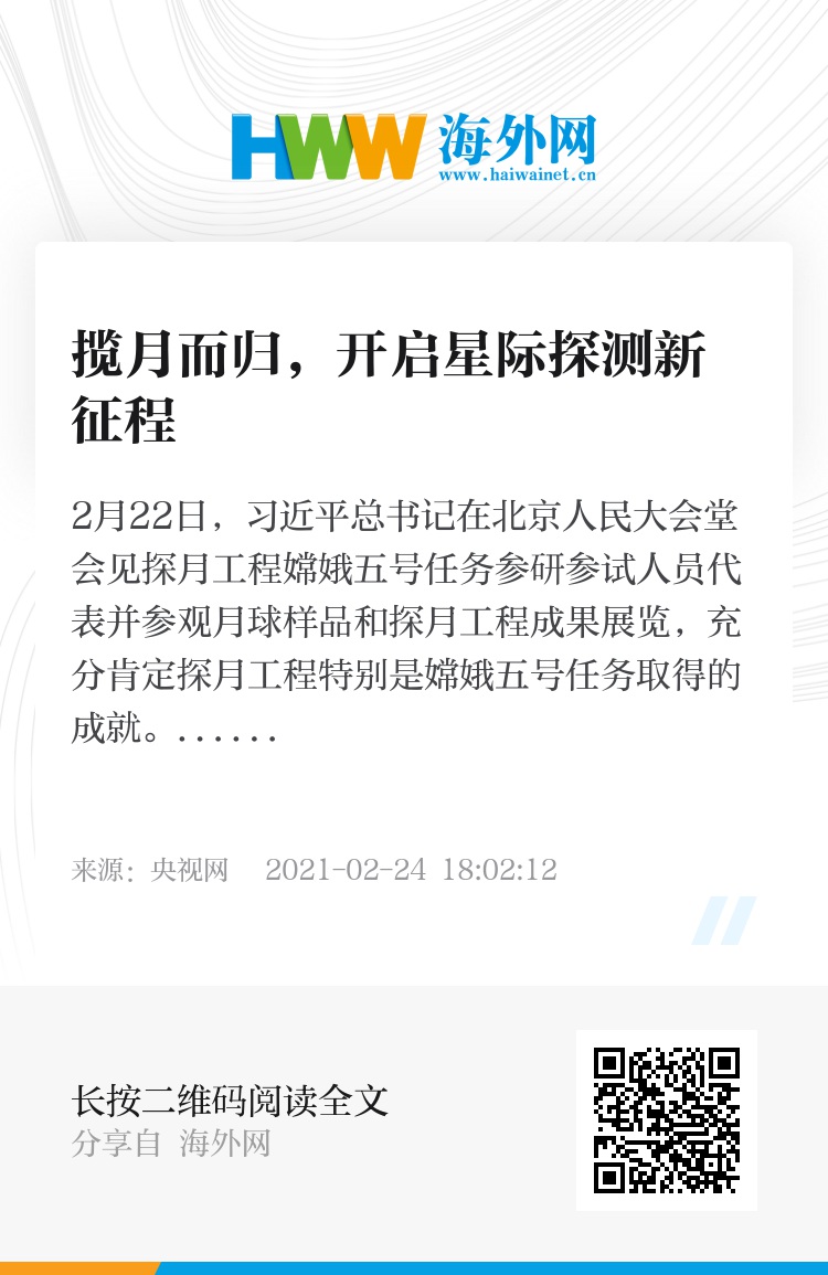 2月22日,习近平总书记在北京人民大会堂会见探月工程嫦娥五号任务参研参试人员代表并参观月球样品和探月工程成果展览,充分肯定探月工程特别是嫦娥五号任务取得的成就。