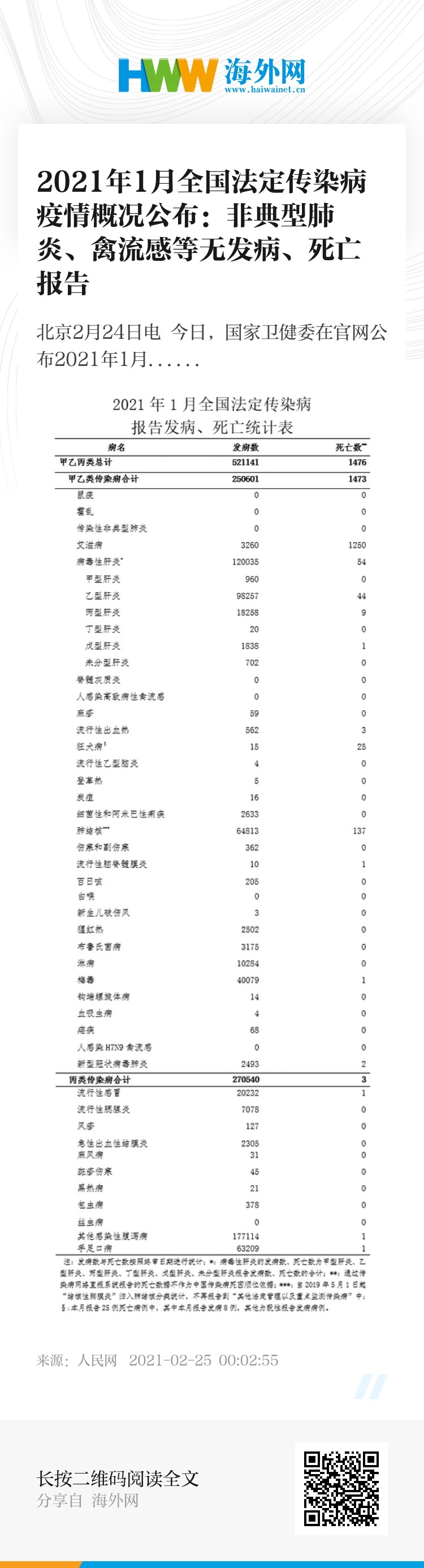 人民网北京2月24日电 今日,国家卫健委在官网公布2021年1月全国法定传染病疫情概况指出,2021年1月(2021年1月1日0时至1月31日24时),全国(不含香港、澳门特别行政区和台湾地区,下同)共报告法定传染病521141例,死亡1476人。