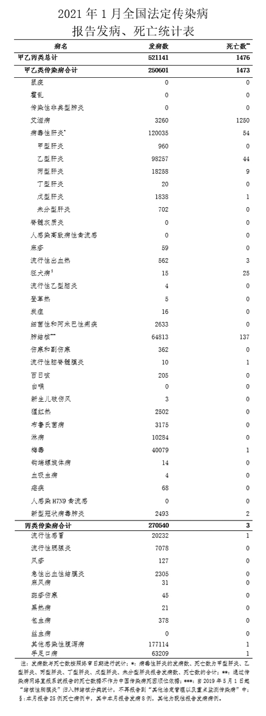 附:2021年1月全国法定传染病报告发病、死亡统计表