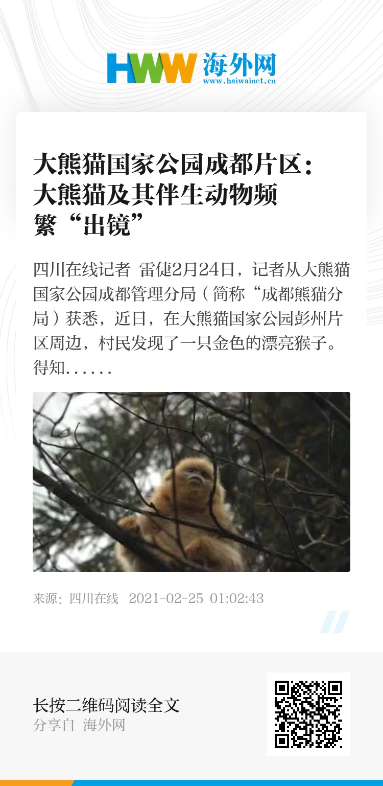 2月24日,记者从大熊猫国家公园成都管理分局(简称“成都熊猫分局)获悉,近日,在大熊猫国家公园彭州片区周边,村民发现了一只金色的漂亮猴子。得知消息后,大熊猫国家公园彭州管护总站立刻派工作人员赶到现场,经鉴定这是我国一级重点保护野生动物——川金丝猴。这只猴子毛色光亮、行动敏捷,在树上灵活跳跃、攀爬,身体处于健康的状态。工作人员及时劝返围观群众并每日对其进行保护性观测,以确保它安全返回猴群。