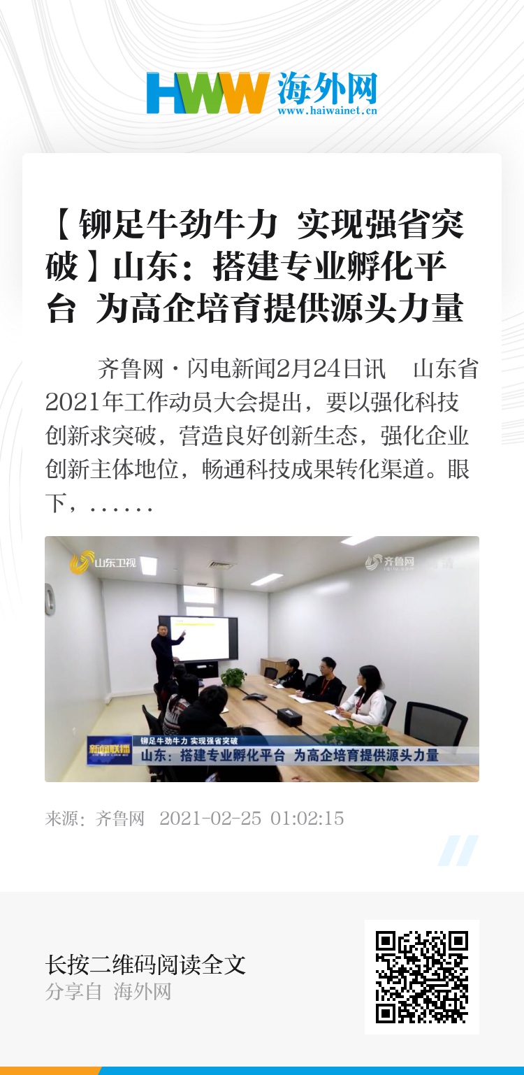 齐鲁网·闪电新闻2月24日讯 山东省2021年工作动员大会提出,要以强化科技创新求突破,营造良好创新生态,强化企业创新主体地位,畅通科技成果转化渠道。眼下,以孵化器为引擎,山东正推动科技型企业群体规模持续壮大。今年,全省高新技术企业计划突破1.7万家,实现科技创新主体量、质双升。