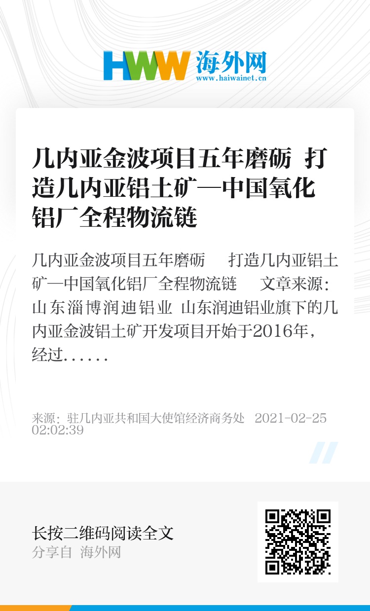 2018年12月17日,与几内亚政府签署了金波铝土矿项目《矿业协议》;
