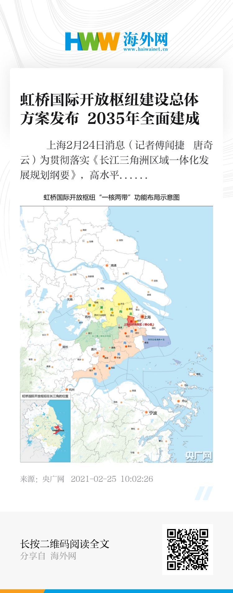 央广网上海2月24日消息(记者傅闻捷 唐奇云)为贯彻落实《长江三角洲区域一体化发展规划纲要》,高水平规划建设虹桥国际开放枢纽,促进长三角地区深化改革、协同开放,《虹桥国际开放枢纽建设总体方案》近日由国务院批复、国家发改委印发。