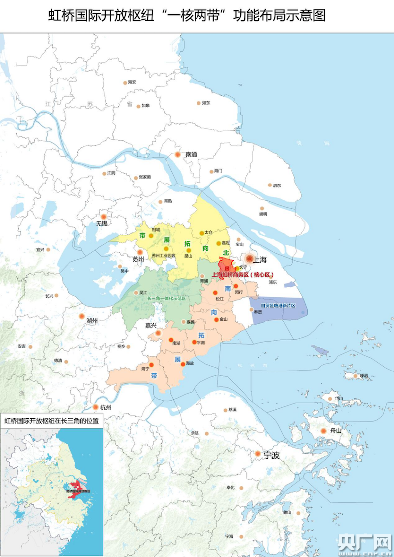 虹桥国际开放枢纽“一核两带”功能布局示意图(央广网发 市政府新闻办供图)