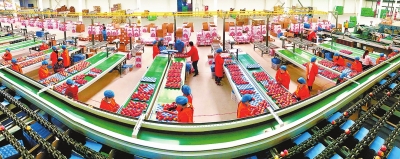 村民在洛宁县上戈镇海升现代化苹果加工车间挑选包装苹果。当地通过发展优质苹果种植,让贫困户脱贫致富。高山岳摄