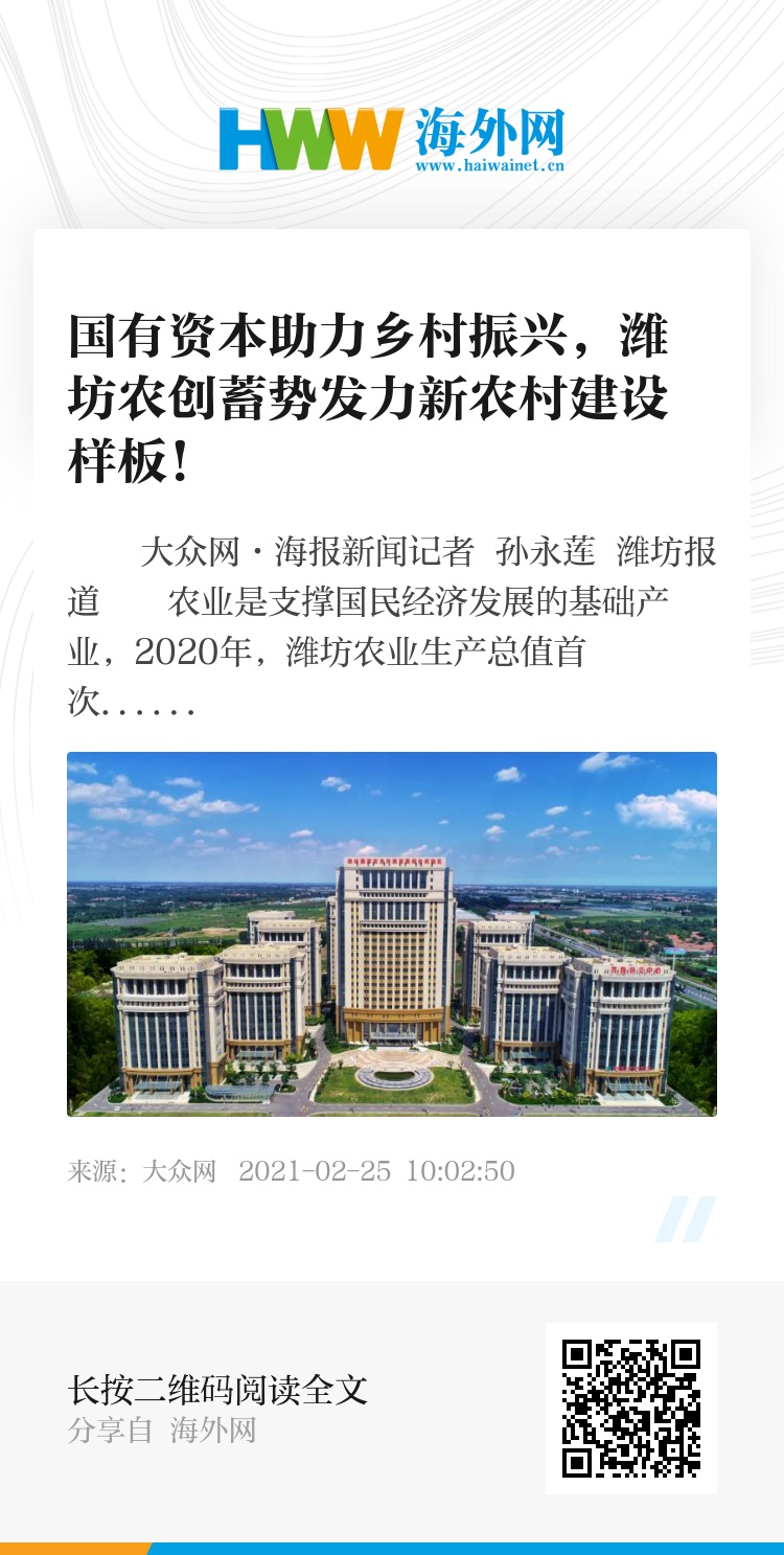 “十四五”开局之年,农业发展仍是重中之重,按照市委市政府的规划要求,“十四五”期间,潍坊全市要继续创新提升“三个模式”,打造乡村振兴齐鲁样板先行区。潍坊“三农”建设实现新突破,离不开强大的资本支持、高质量的新项目开发和不断开拓农业发展新渠道,而这些都加速了潍坊三农创新发展集团(以下简称“潍坊农创集团”)的成长,扛起“强农”重任。