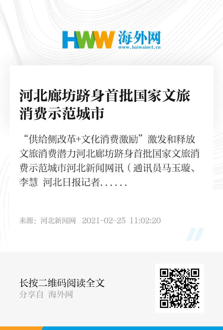 近年来,河北省廊坊市一手抓以特色文化产品提升及文创品牌树立为代表的供给侧改革,一手抓以文化消费系列展会及消费补贴为代表的消费激励,大力激发和释放文旅消费潜力,初步形成了“供给侧改革+文化消费激励”模式,促进了文旅消费市场振兴。前不久,该市被文化和旅游部、发展改革委、财政部确定为第一批15个国家文化和旅游消费示范城市之一,成为河北省唯一入选的城市。