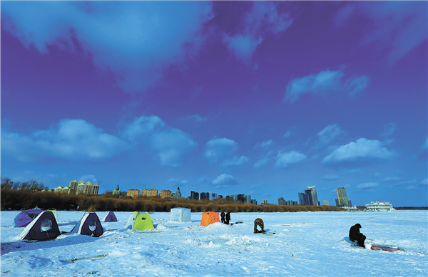 冬日里的天空湛蓝、澄澈,那是“冰城蓝”。站在江边的高处,抬头仰望,两三朵“伞花”在空中飞舞,那是勇敢者的游戏——在天空中自由自在地飞翔,拥抱阳光,拥抱蓝天;俯首低视,一湖三岛水域上,蓝色的、绿色的、红色的帐篷,仿佛白色“画布”中的点缀,那是垂钓者寒冬里的闲情逸致。远眺间,当层层薄云飘过蓝天,这仿若宫崎骏动画中的“天空之城”。