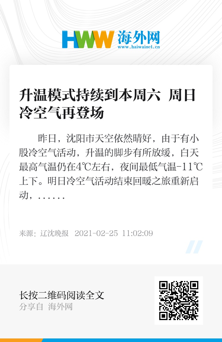 昨日,沈阳市天空依然晴好,由于有小股冷空气活动,升温的脚步有所放缓,白天最高气温仍在4℃左右,夜间最低气温-11℃上下。明日冷空气活动结束回暖之旅重新启动,明后两天气温接连回升,后天白天最高气温有望创造今年以来气温的新高。