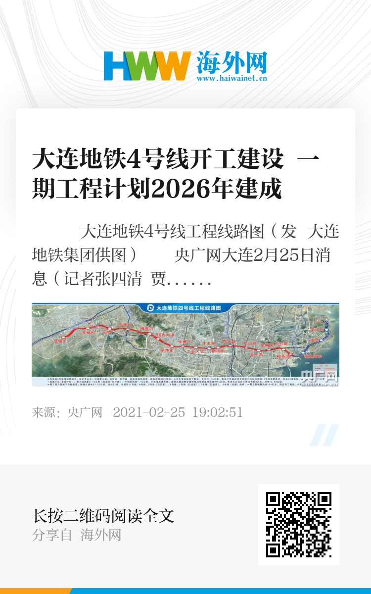 央广网大连2月25日消息(记者张四清 贾铁生)2月25日,大连地铁4号线开工建设,线路西起营城子,东至龙头石,全长27.76公里,共设20座车站。此次开工建设的地铁4号线一期工程(营城子站至梭鱼湾站),投资194亿元,线路长度23.01公里,设站17座,计划2026年5月建成,将成为大连城市核心北部东西骨架线,改善周边市民出行便捷度。此外,在建的大连地铁5号线计划于2023年底前通车试运营。