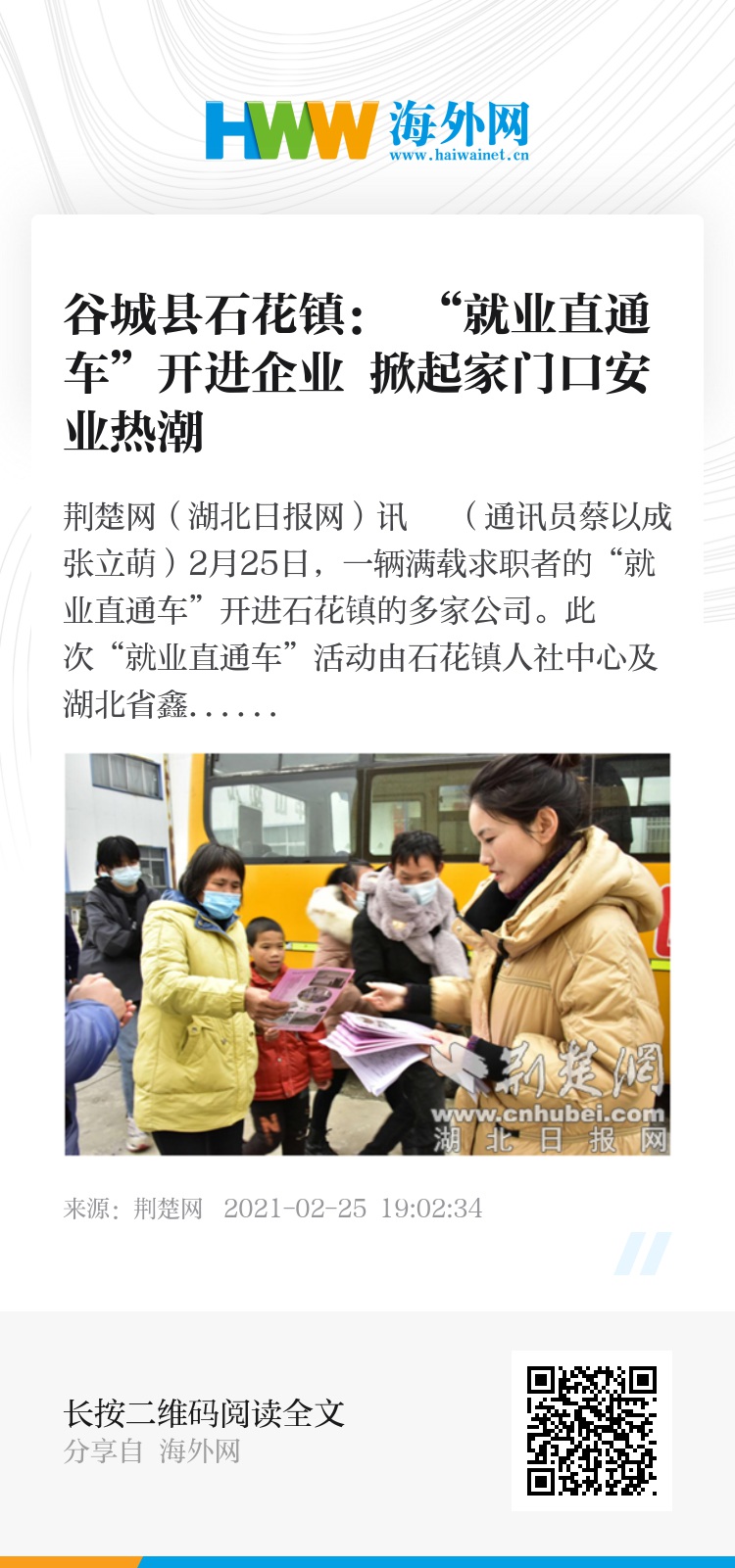 荆楚网(湖北日报网)讯 (通讯员蔡以成 张立萌)2月25日,一辆满载求职者的“就业直通车”开进石花镇的多家公司。此次“就业直通车”活动由石花镇人社中心及湖北省鑫存人力资源开发有限公司联合举办,共22人参加,其中不乏建档立卡贫困户、残疾人、待业大学生、返乡人员等群体。