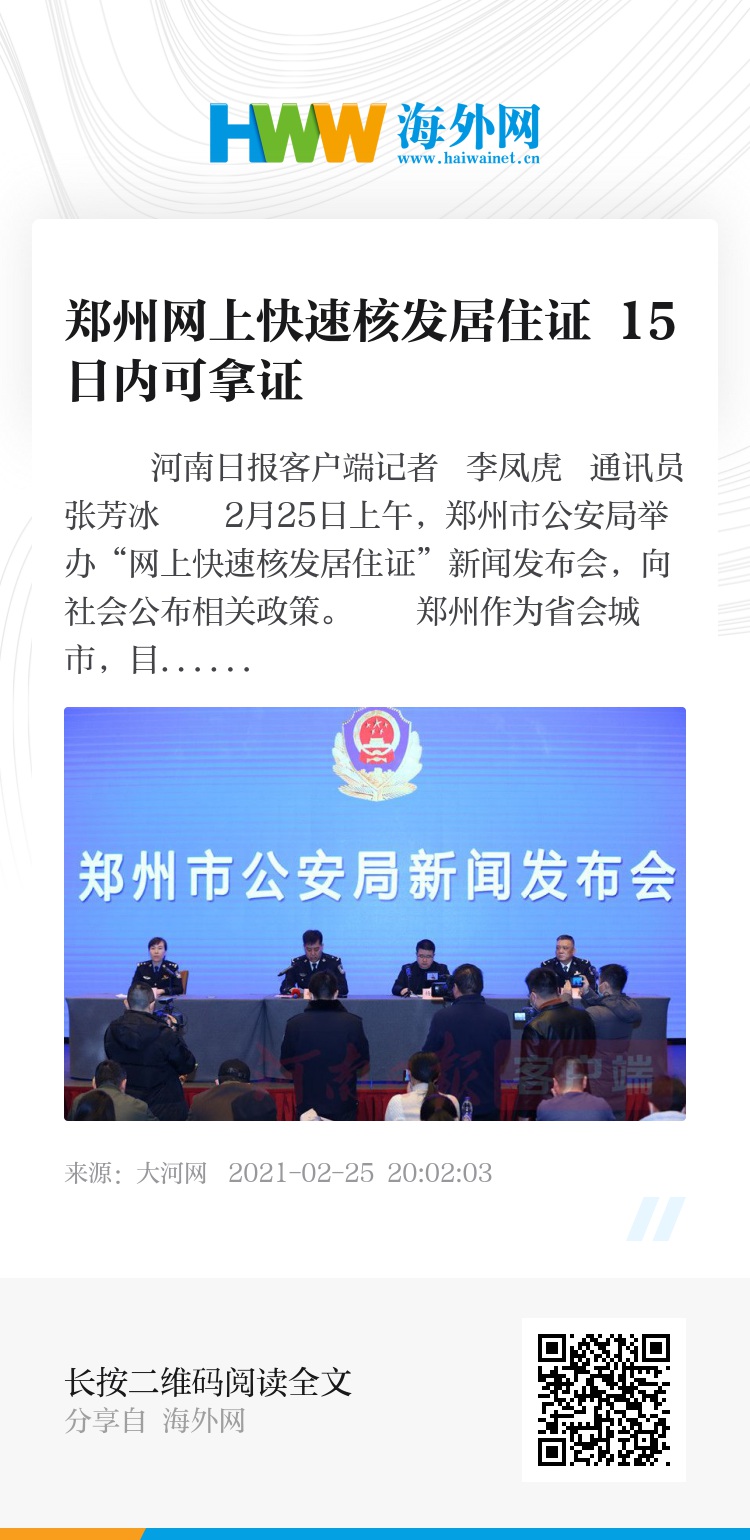 2月25日上午,郑州市公安局举办“网上快速核发居住证”新闻发布会,向社会公布相关政策。