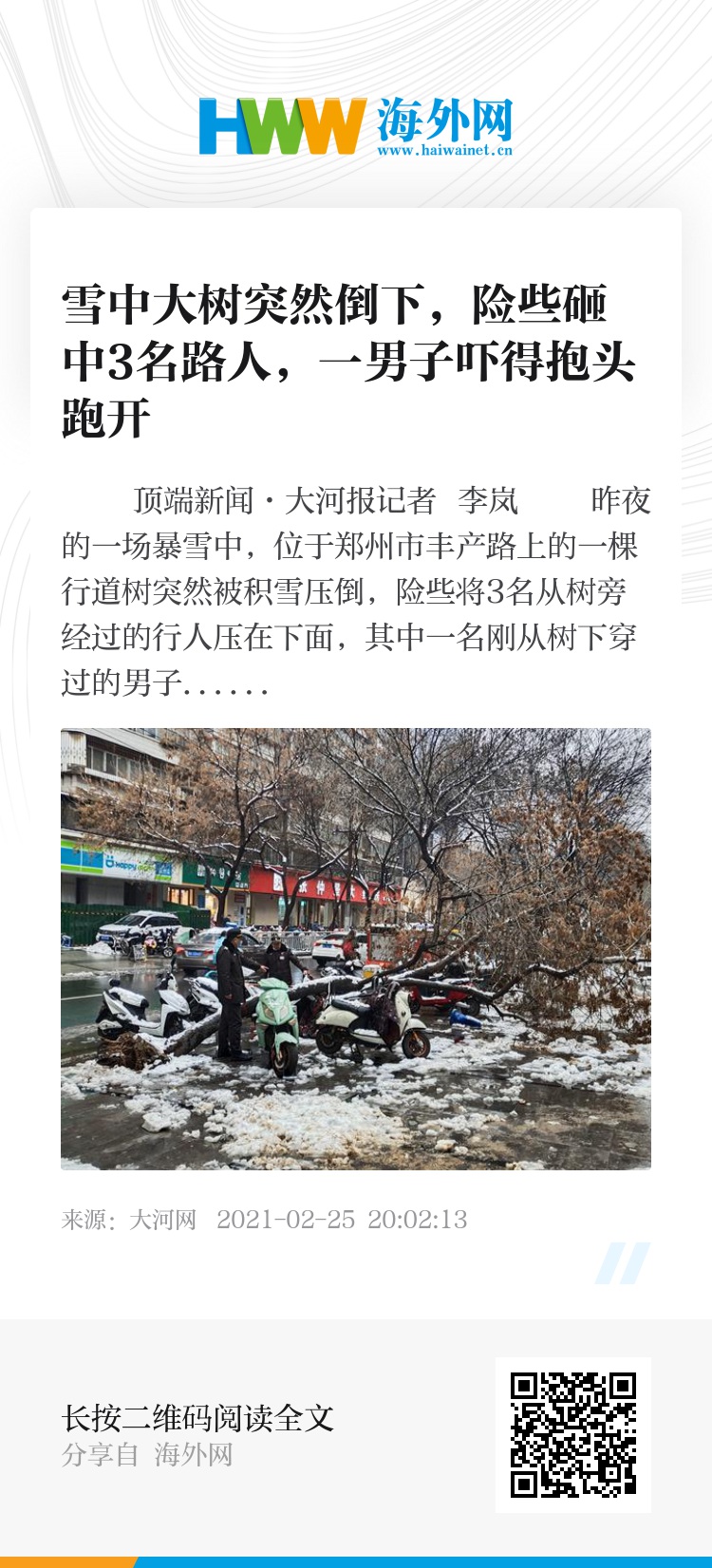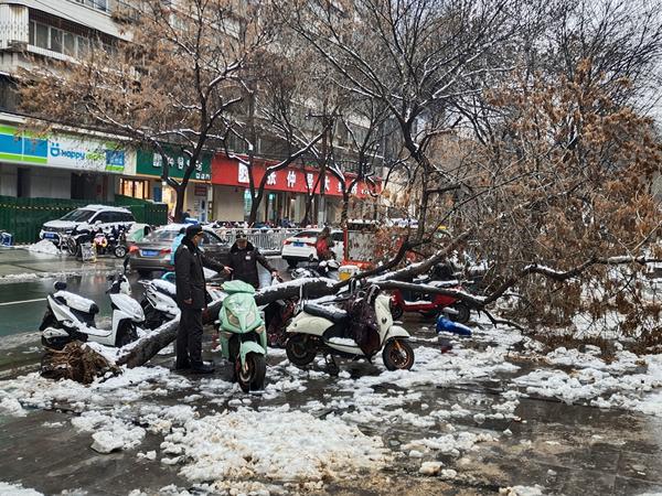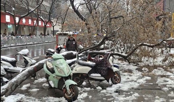 昨夜的一场暴雪中,位于郑州市丰产路上的一棵行道树突然被积雪压倒,险些将3名从树旁经过的行人压在下面,其中一名刚从树下穿过的男子,眼看着大树倒下来,吓得抱头就跑……