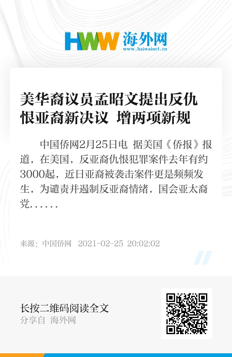 中国侨网2月25日电 据美国《侨报》报道,在美国,反亚裔仇恨犯罪案件去年有约3000起,近日亚裔被袭击案件更是频频发生,为谴责并遏制反亚裔情绪,国会亚太裔党团第一副主席、皇后区国会议员孟昭文24日再次向众议院提出反亚裔仇恨相关的新决议,H.Res.151号新决议增加两项新规,包括扩大政府各部门和社区组织对举报仇恨犯罪案件的教育和发行正确表述新冠肺炎的指南。
