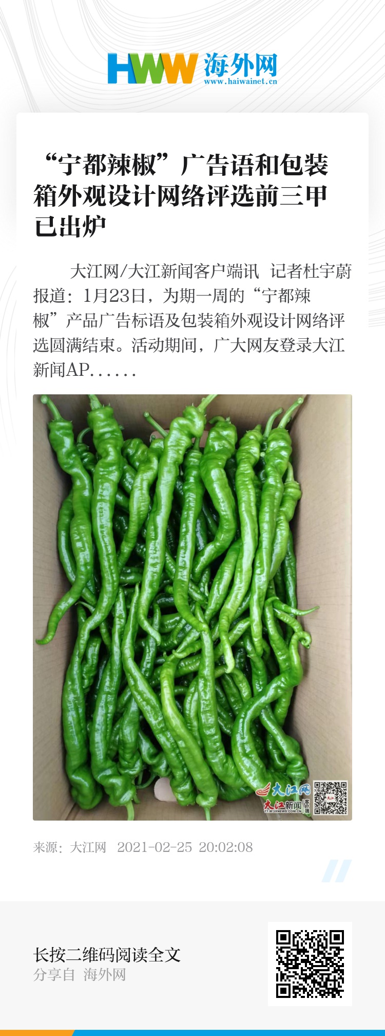 自2月17日以来,大江新闻APP推出为期一周的“宁都辣椒”产品广告语和包装箱外观设计网络评选活动。网友们积极参与投票。评选出能够代表“宁都辣椒”形象的广告语和包装箱外观设计方案。本次征集活动由大江网、大江新闻客户端联合宁都县蔬菜产业发展领导小组、宁都县融媒体中心、宁都县蔬菜协会共同发起,活动分为征集、网络评选、专家评选、获奖公布四个阶段。