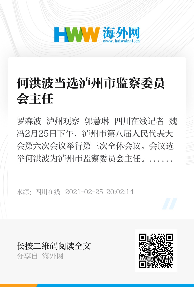 2月25日下午,泸州市第八届人民代表大会第六次会议举行第三次全体会议。会议选举何洪波为泸州市监察委员会主任。