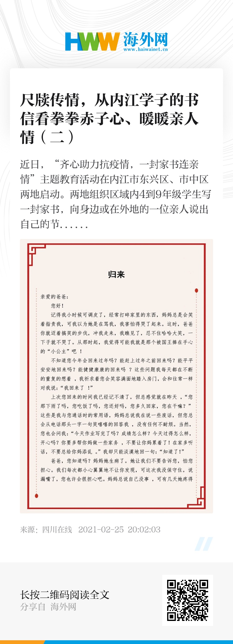 近日,“齐心助力抗疫情,一封家书连亲情”主题教育活动在内江市东兴区、市中区两地启动。两地组织区域内4到9年级学生写一封家书,向身边或在外地的一位亲人说出自己的节日问候、学习生活近况、家乡变化等,传递温情与感恩,凝聚奋进力量。