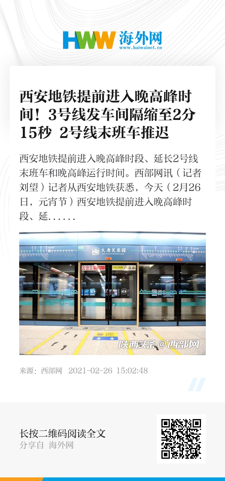 西安地铁提前进入晚高峰时段、延长2号线末班车和晚高峰运行时间。