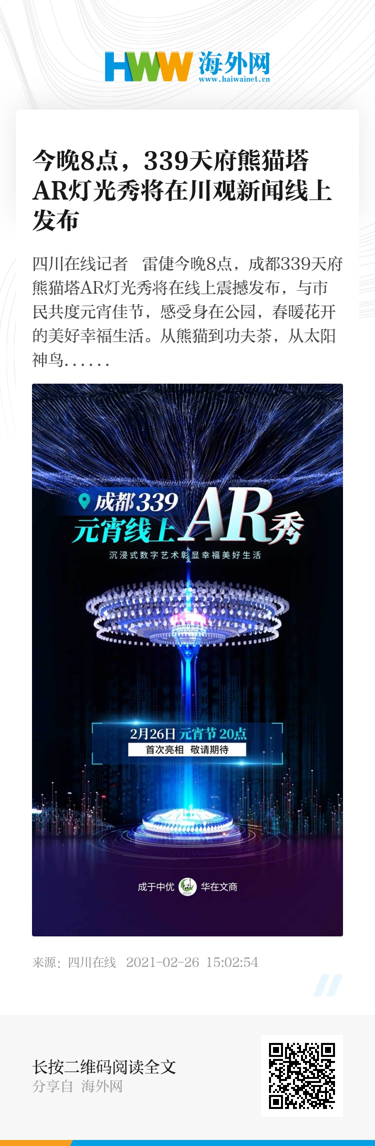 今晚8点,成都339天府熊猫塔AR灯光秀将在线上震撼发布,与市民共度元宵佳节,感受身在公园,春暖花开的美好幸福生活。