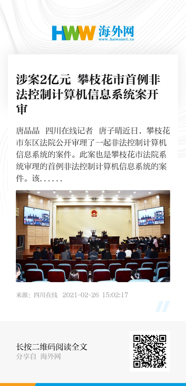 近日,攀枝花市东区法院公开审理了一起非法控制计算机信息系统的案件。此案也是攀枝花市法院系统审理的首例非法控制计算机信息系统的案件。