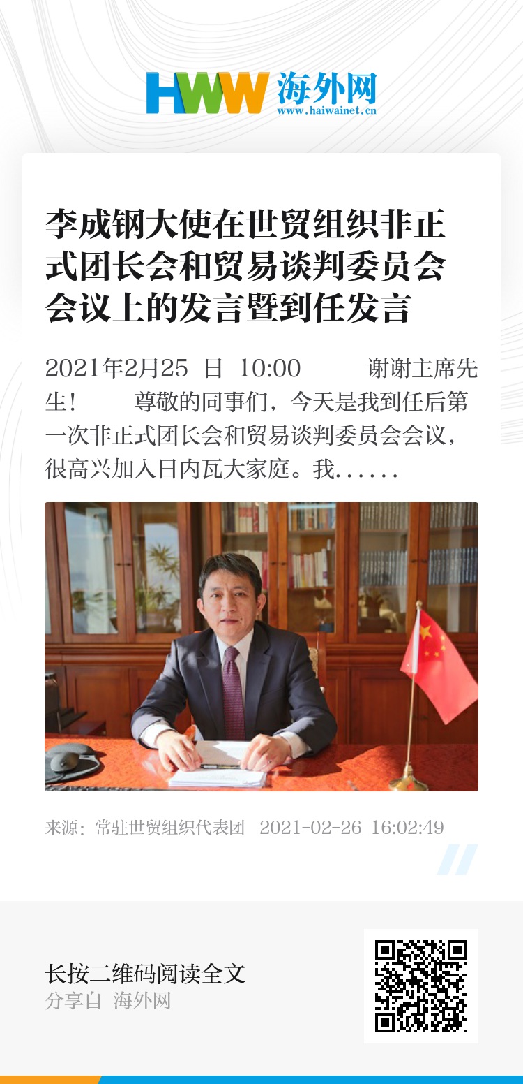 “雄关漫道真如铁,而今迈步从头越!”主席先生,让我们乘着总干事任命、MC12时间地点确定这些新开端的东风,坚定信心,砥砺前行,还世界一个正常运行的、值得信赖的、有所作为的世贸组织!