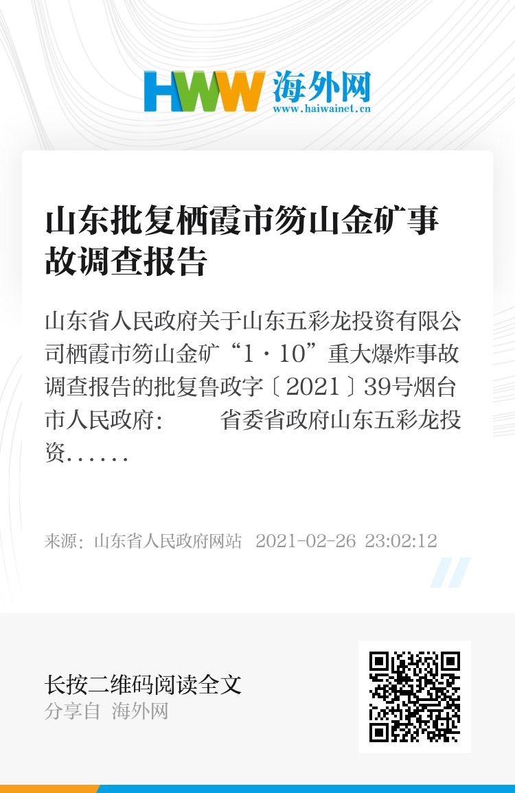 省委省政府山东五彩龙投资有限公司栖霞市笏山金矿“1·10”重大爆炸事故调查组(以下简称“事故调查组”)提交的《山东五彩龙投资有限公司栖霞市笏山金矿“1·10”重大爆炸事故调查报告》(以下简称《调查报告》)已经国务院安委会办公室审核同意,并经省委、省政府研究审定,现批复如下: