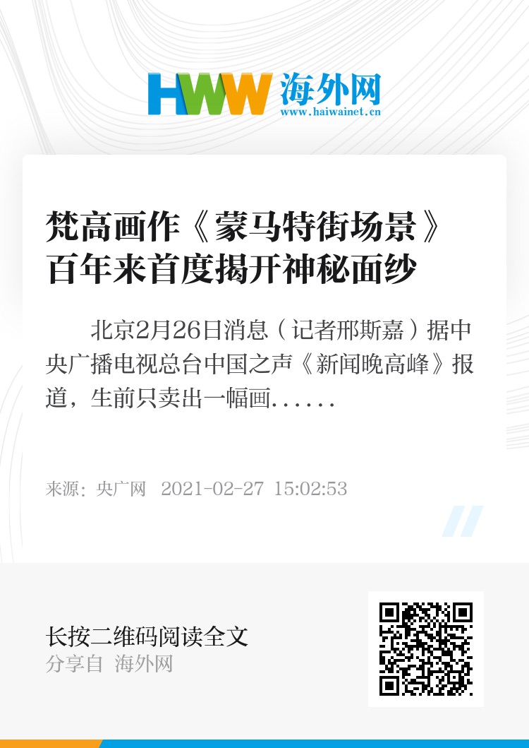 央广网北京2月26日消息(记者邢斯嘉)据中央广播电视总台中国之声《新闻晚高峰》报道,生前只卖出一幅画作的梵高可能不会想到,在100多年后,单是他的一幅画,就可卖出亿元天价。近日,荷兰著名画家文森特・梵高的一幅“罕见画作”首次公开展出。这幅描绘巴黎蒙马特附近街道的作品在1887年创作,100多年来一直由一个未披露姓名的家族私人收藏,而一个月后,也就是3月25日,巴黎苏富比拍卖行将对此画作公开拍卖。苏富比方面估价,这幅画作的价值可能在500万到800万欧元之间,并称“希望作品能够出乎意料”。那么,最新亮相的这幅百年画作,又将具有怎样的市场价值?