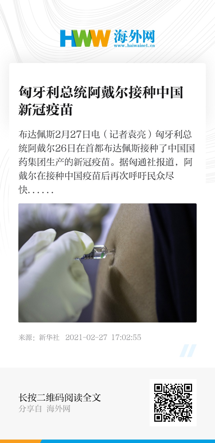 新华社布达佩斯2月27日电(记者袁亮)匈牙利总统阿戴尔26日在首都布达佩斯接种了中国国药集团生产的新冠疫苗。