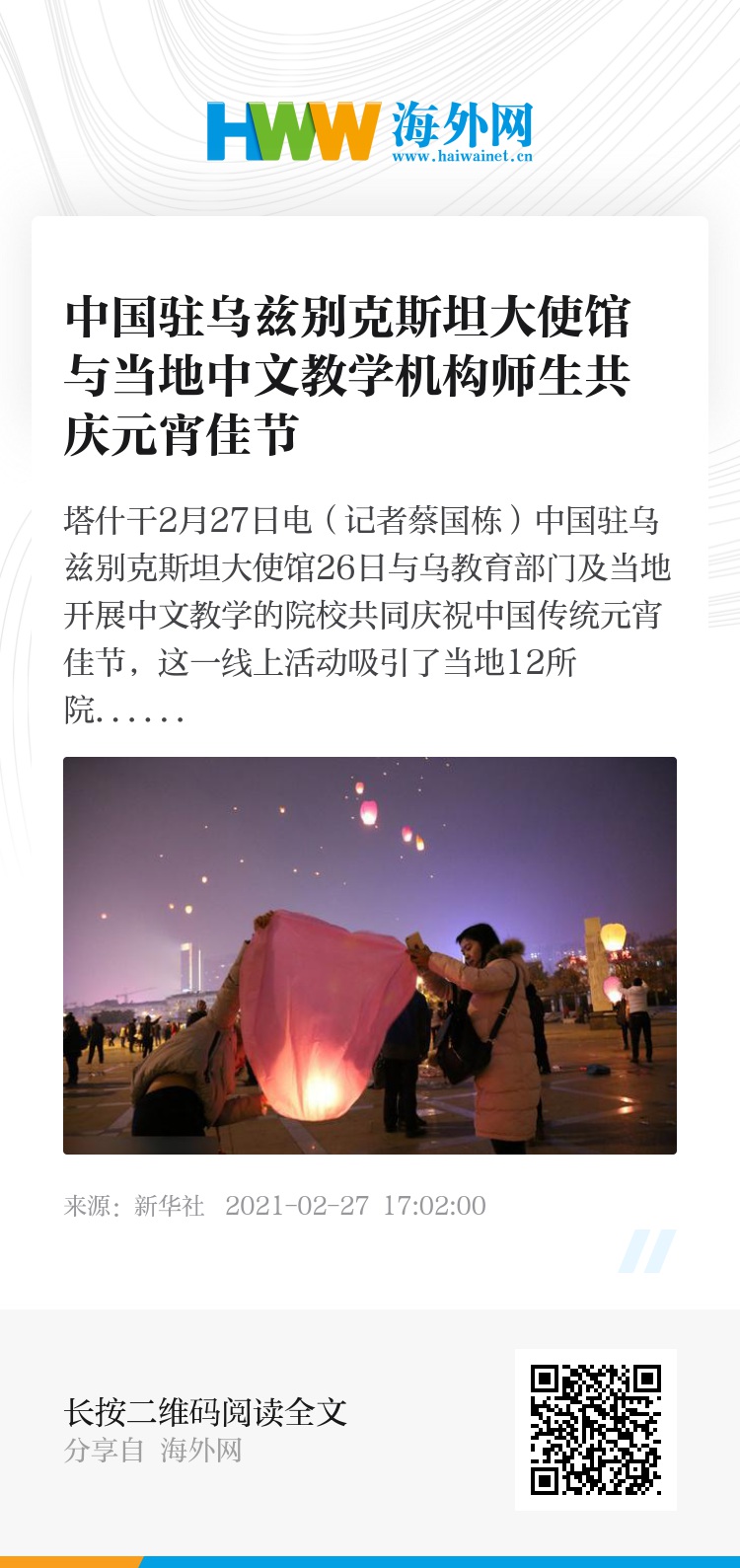 新华社塔什干2月27日电(记者蔡国栋)中国驻乌兹别克斯坦大使馆26日与乌教育部门及当地开展中文教学的院校共同庆祝中国传统元宵佳节,这一线上活动吸引了当地12所院校师生代表等近120人参加。